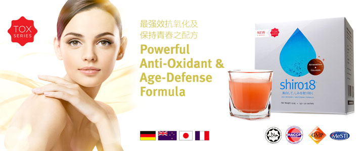 Shiro18™ is a breakthrough product that enhances outer beauty and rejuvenates the body. Shiro18™ is carefully formulated by leading Japanese beauty lab by combining expensive raw ingredient produced by top world leading biotechnology developers to overcome concerns on skin aging. Such effective combination materials like AstaReal® Astaxanthin, Naticol® Marine Collagen, Glycine, Grape Seed extract, Blackcurrant extract, Vitamin C and E proved to be wonderful antioxidants. Shiro18™ greatly helps in eliminating free radicals within the body, thus achieving fairer and healthier looking skin.